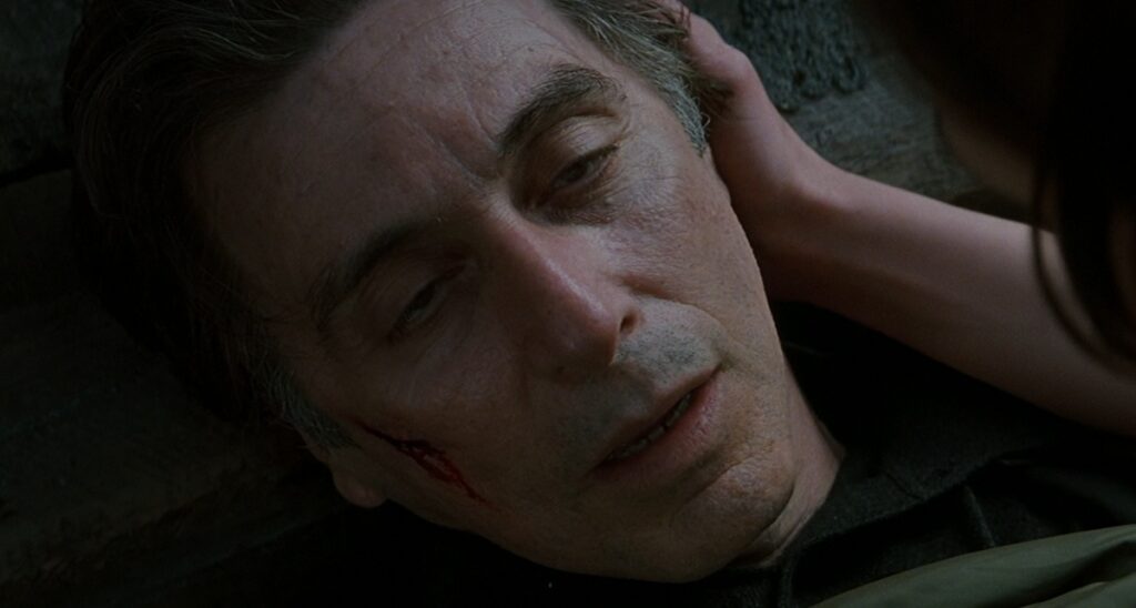 Cette imprévisibilité est présente tout au long du film, Finch semblant presque omniscient et omniprésent. Il appelle Dormer à des heures étranges, sachant qu’il est réveillé, comme s’il pouvait le voir. Il dit également toujours qu’il va faire une chose, puis en fait souvent une autre, profitant de l’état délirant de Dormer, privé de sommeil. La présence répétée de la carte maîtresse ressort dans les derniers instants d’Insomnia.